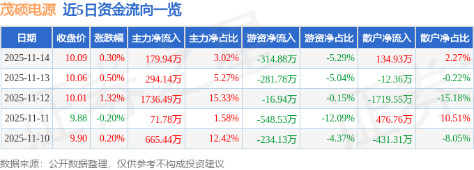 发布日期:2025-11-15 17:13:38 作者: 环球直播室证券之星音讯,到2025年11月14日收盘,茂硕电源(002660)报收于10.09元,上涨0.3%,换手率1.72%,成交量5.89万手,成交额5954.67万元。